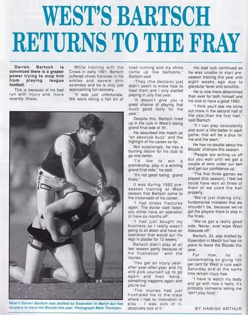 Over the years, I was drafted by five different AFL clubs: the West Coast Eagles, Geelong, the Adelaide Crows, the Brisbane Bears, and Essendon. Each time, for one reason or another, it just wasn't meant to be. From injuries to business commitments, the stars never quite aligned for me to play a senior AFL game.